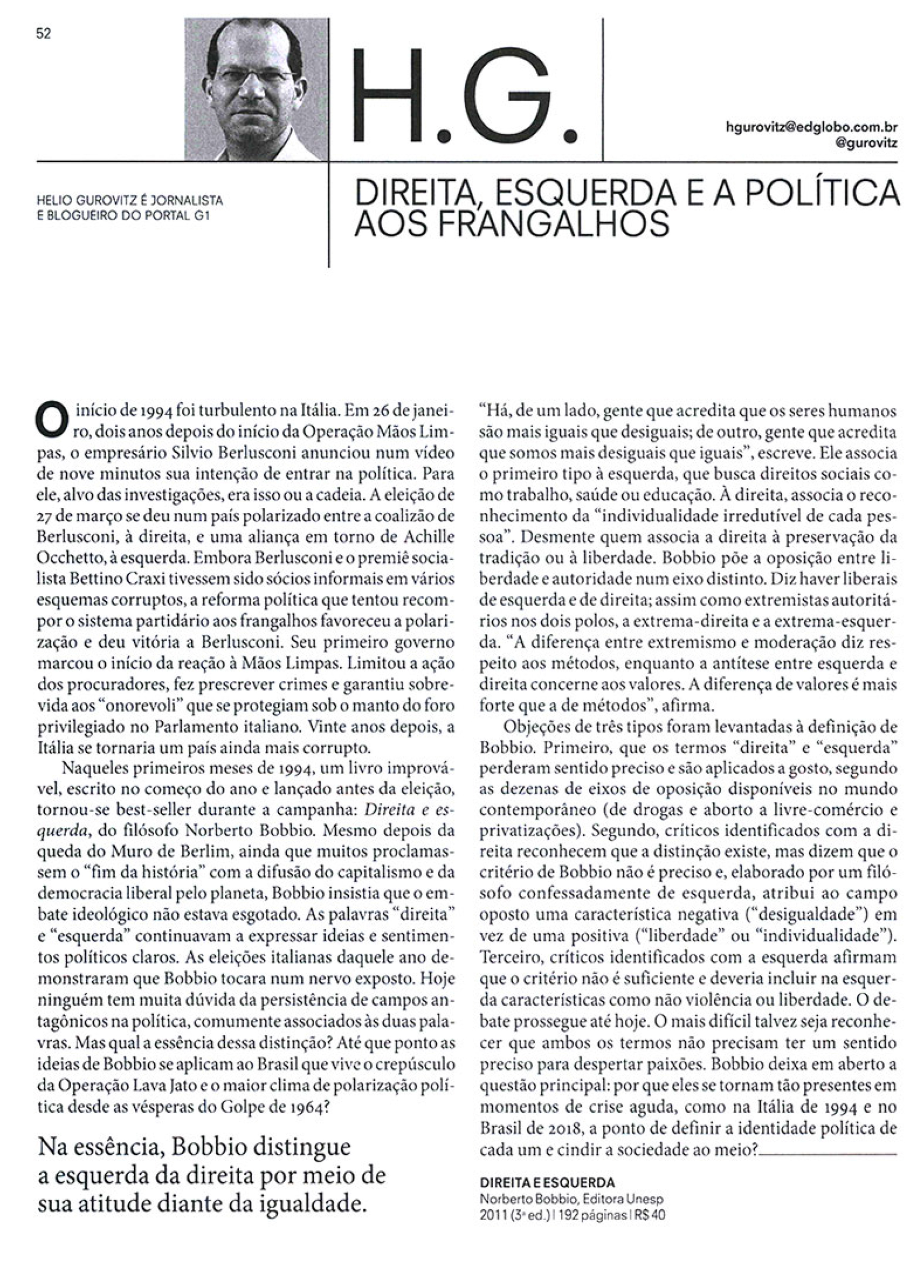 O jornalista Helio Gurovitz, em sua coluna na revista Época, destacou o livro Direita e esquerda – 3ª edição: razões e significados de uma distinção política, de Norberto Bobbio. Quando de sua primeira edição, em 1999, Norberto Bobbio, um dos principais pensadores contemporâneos, deu uma resposta a quem preconizava que já não fazia sentido distinguir direita e esquerda, pois na globalização a análise dos problemas políticos e econômicos expandira-se para além das fronteiras dos Estados nacionais: “Parece-me ter ocorrido exatamente o contrário, ou seja, que a distinção não está morta e sepultada, mas mais viva do que nunca”.