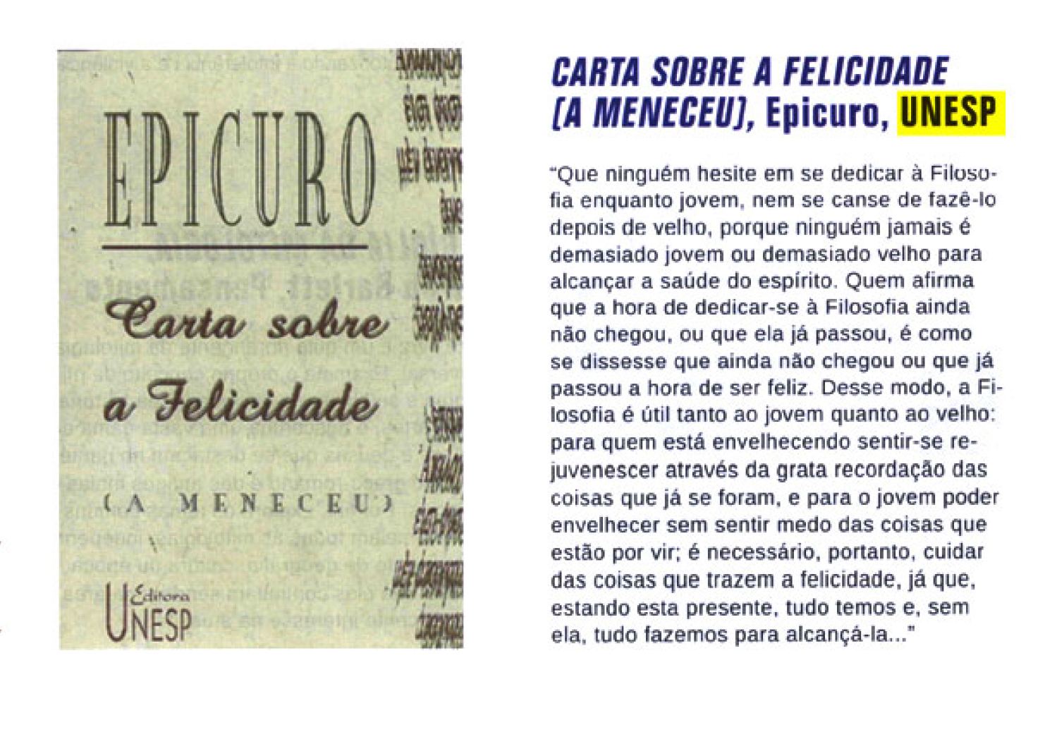 A revista Filosofia Prática recomendou, em sua edição de julho, a leitura do livro Carta sobre a felicidade (a Meneceu), de Epicuro. Nesta obra Epicuro de Samos discorre sobre o valor da filosofia na conquista da felicidade. Ele adverte que nunca se é jovem ou velho demais para se dedicar a ela e sustenta que tal realização só é possível por meio da filosofia.