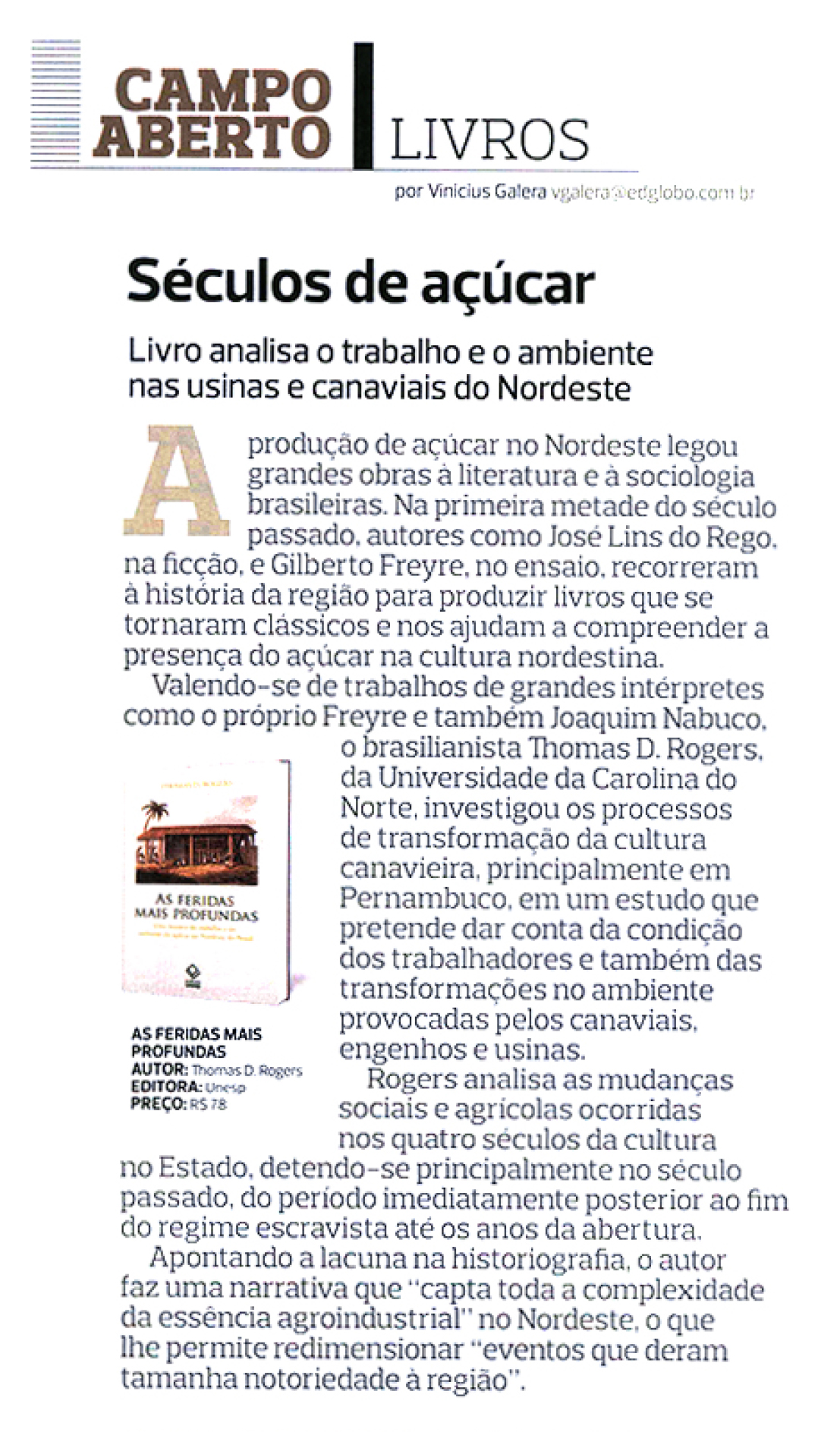 A revista Globo Rural, em sua edição de junho de 2017, recomendou a leitura do lançamento As feridas mais profundas, de Thomas D. Rogers. Neste livro, Thomas D. Rogers analisa as mudanças sociais e ambientais em quatro séculos da história de Pernambuco, um dos principais centros da produção açucareira no Brasil. A obra enfoca principalmente o período que se inicia com a abolição do regime escravista e vai até o século XX. Revisitando de forma crítica a bibliografia canônica sobre o tema, com destaque para a obra de Gilberto Freyre, Rogers realiza um profundo mergulho no cenário agrícola pernambucano do último século e no quanto ele é tributário dessa história.