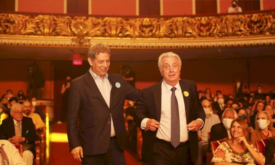 Diretor-presidente da Fundação Editora da Unesp, Jézio Hernani Bomfim Gutierre, e jurista Wálter Fanganiello Maierovitch a caminho do palco para receberem a estatueta do Jabuti