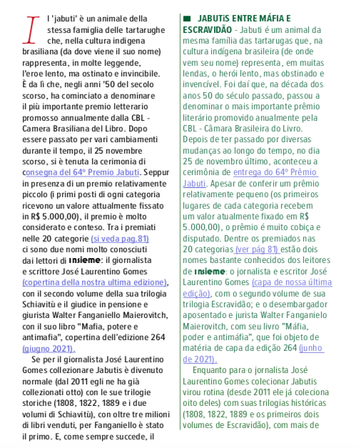 A Revista Insieme, voltada à comunidade italiana no Brasil, destacou a vitória do jurista Wálter Fanganiello Maierovitch, no Prêmio Jabuti. Ele é autor de Máfia, poder e antimáfia: um olhar pessoal sobre uma longa e sangrenta história, que conquistou o 1º lugar na categoria Ciências Sociais da 64ª edição do prêmio.