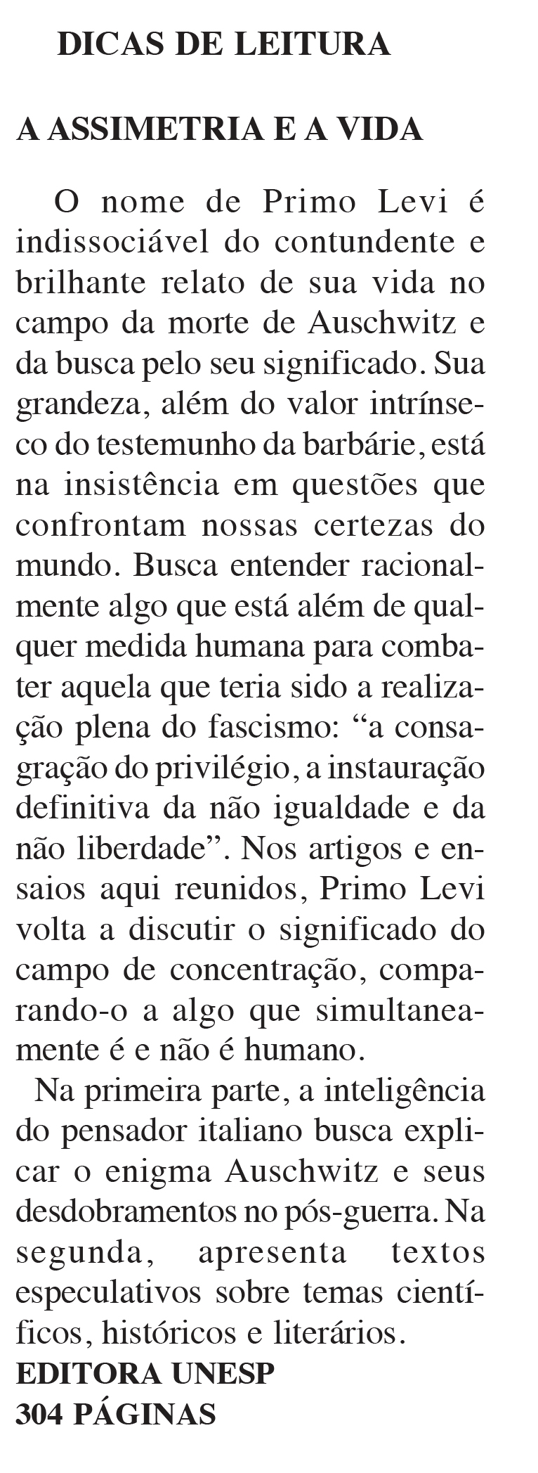 A edição de novembro da Revista Israel, publicação impressa voltada à comunidade judaica, trouxe como dica de leitura o livro A assimetria e a vida: Artigos e ensaios 1955-1987, de Primo Levi.