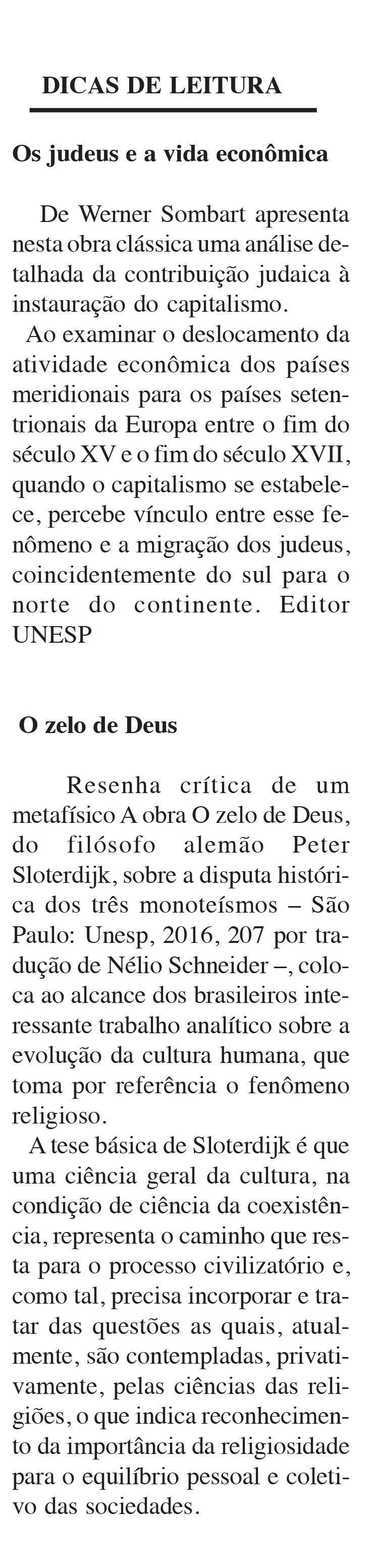 A edição de janeiro da Revista Israel, publicação impressa voltada à comunidade judaica, trouxe como dica de leitura os livros Os judeus e a vida econômica, de Werner Sombart, e O zelo de Deus: Sobre a luta dos três monoteísmos, de Peter Sloterdijk.