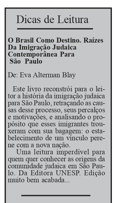 A edição de outubro da Revista Israel, publicação impressa voltada à comunidade judaica, trouxe como dica de leitura o livro O Brasil como destino: Raízes da imigração judaica contemporânea para São Paulo – 2ª edição, de Eva Alterman Blay.