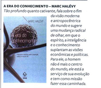 A revista Joyce Pascowitch recomendou a leitura de A era do conhecimento: princípios e reflexões sobre a revolução noética no século XXI, de Marc Halévy. Este livro é uma potente ferramenta de leitura do mundo e do sentido de nossa existência.