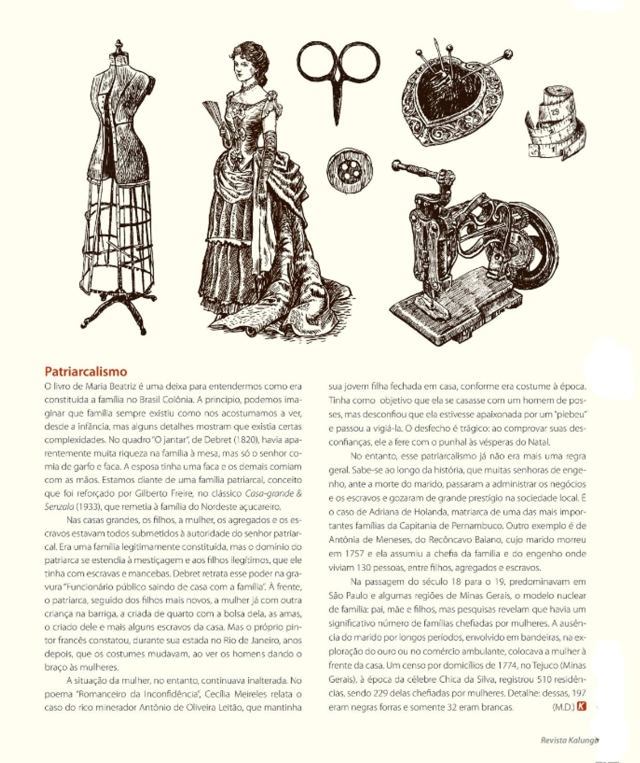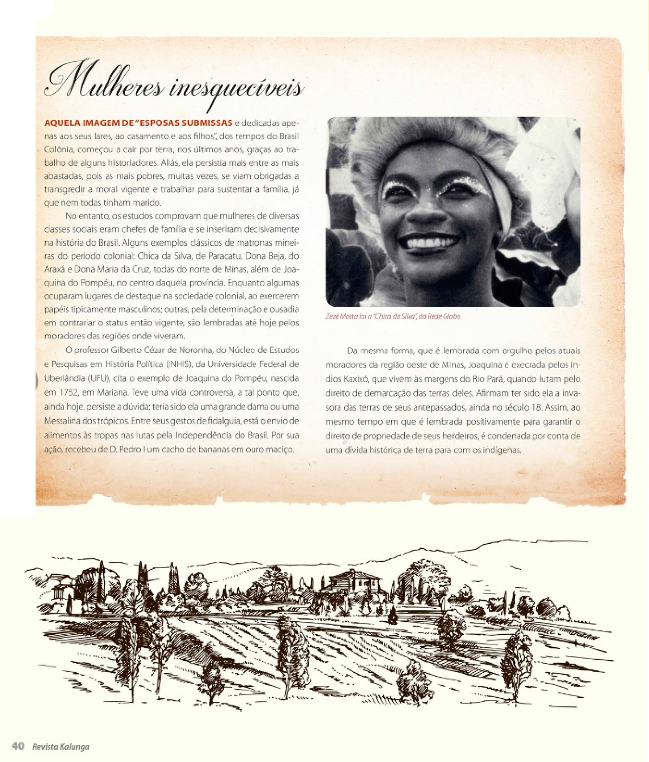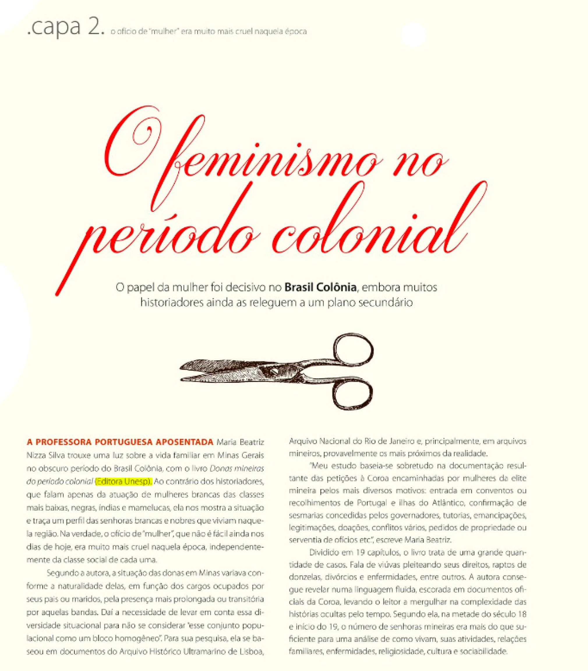 A edição de março da Revista Kalunga destacou o livro Donas mineiras do período colonial, de Maria Beatriz Nizza da Silva. De modo geral, a historiografia brasileira da sociedade colonial privilegia, sem sombra de dúvida, as mulheres de origem africana; pouco analisa as mamelucas e as mestiças de índios e negros; e esquece as brancas de condição nobre para se debruçar apenas sobre as plebeias pobres. A obra analisa esse viés inexplorado e preenche tal lacuna historiográfica.