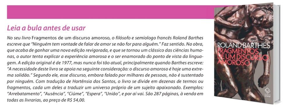 A revista Kalunga recomendou o lançamento Fragmentos de um discurso amoroso, de Roland Barthes. Na obra, Barthes propõe caminhos originais e estimulantes para explicar – ou pelo menos esclarecer – a experiência amorosa e o ser enamorado.