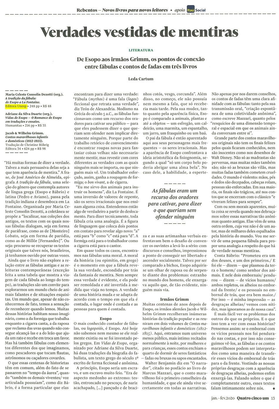 A obra A tradição da fábula: de Esopo a La Fontaine, organizada por Maria Celeste Consolin Dezotti, é analisada pela revista Quatro Cinco Um em pesquisa de pontos de conexão entre fábulas e contos de fadas - ao lado de outros dois títulos.