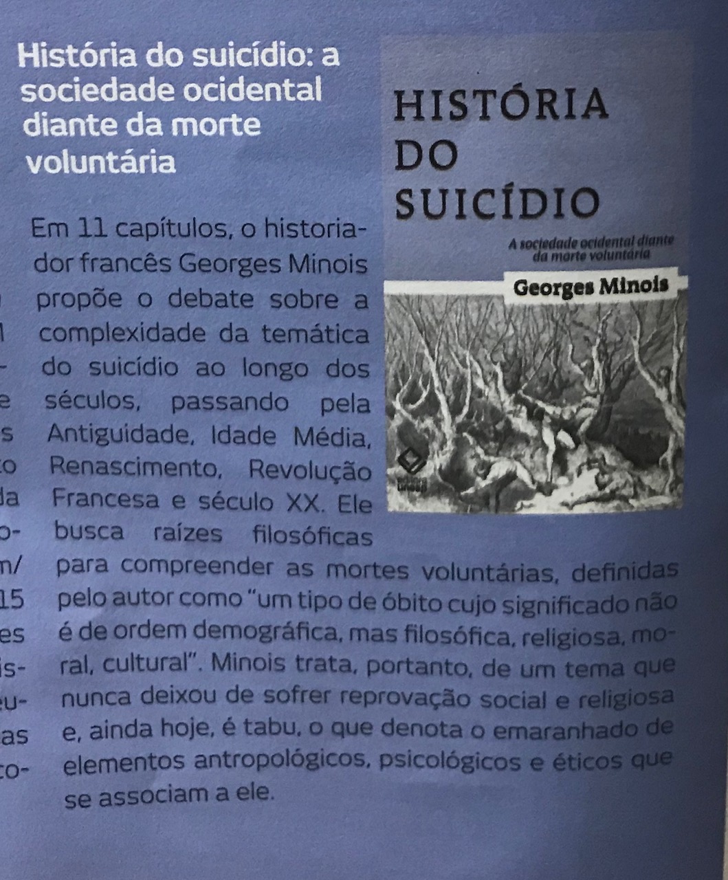 A revista Psi, publicação do Conselho Regional de Psicologia de São Paulo, recomendou a leitura do lançamento História do suicídio: a sociedade ocidental diante da morte voluntária, de Georges Minois. Georges Minois realiza um voo de amplo alcance, debruçando-se sobre farta documentação, para tentar ampliar nosso arsenal argumentativo sobre um dos últimos tabus do nosso tempo.