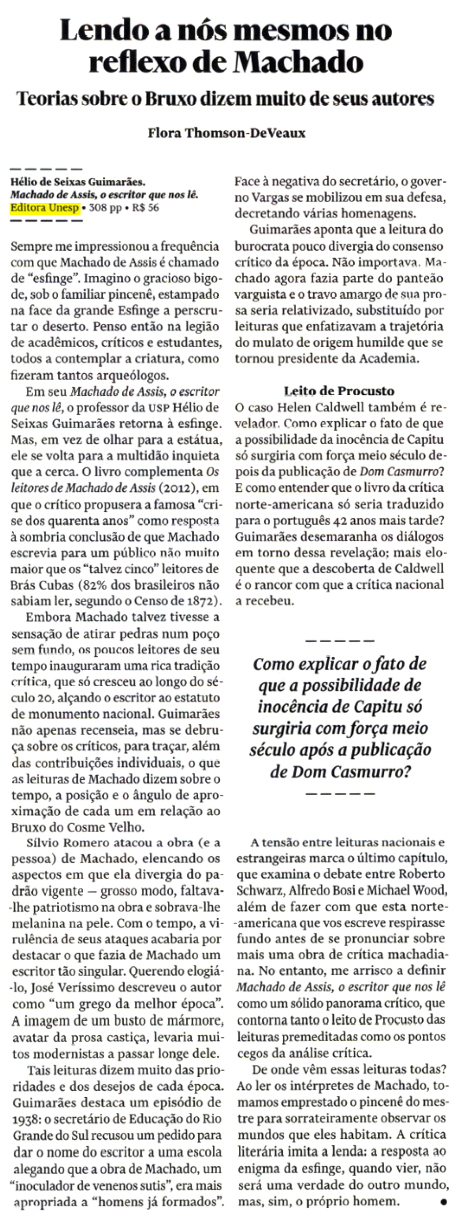 A revista Quatro Cinco Um, em sua primeira edição, em maio, resenhou o lançamento Machado de Assis, o escritor que nos lê, de Hélio de Seixas Guimarães. O autor há muitos anos se debruça não só sobre a obra de Machado de Assis, mas também sobre sua recepção pela crítica e pelos leitores. Nesta obra, contudo, ele não tencionou compor uma história dessa recepção, missão já realizada em outros trabalhos – como, por exemplo, os de José Galante de Sousa, Jean-Michel Massa e Ubiratan Machado, que têm procurado organizar a fortuna crítica mais extensa das nossas letras. Seu objetivo, neste livro resultante da tese de livre-docência defendida na Faculdade de Filosofia, Letras e Ciências Humanas da Universidade de São Paulo, foi estabelecer quatro momentos considerados como de inflexão na percepção e no entendimento do que o autor entende como um processo de construção de quatro figuras de Machado: o escritor excêntrico, o mito nacional, o escritor internacionalizado e o autor realista.