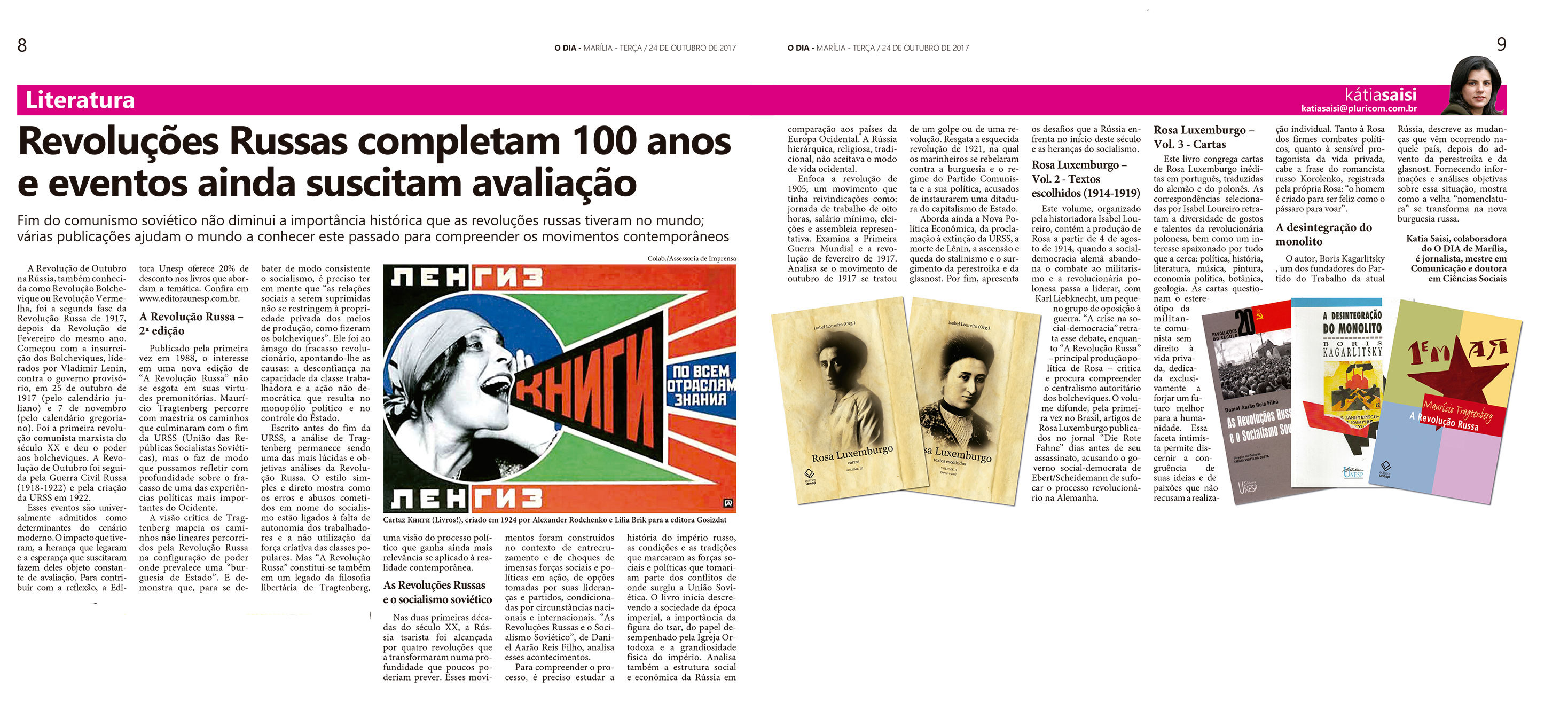 O jornal O Dia de Marília, em sua edição de 24 de outubro, destacou os títulos da Editora Unesp que abordam a Revolução Russa. Por ocasião dos 100 anos da revolução, alguns livros estão com 20% de desconto até 8 de novembro. Confira aqui.