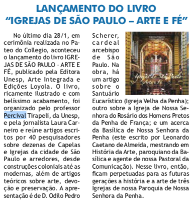 O jornal Santuário da Penha trouxe o livro Igrejas de São Paulo: Arte e fé, organizado por Percival Tirapeli e Laura Carneiro.