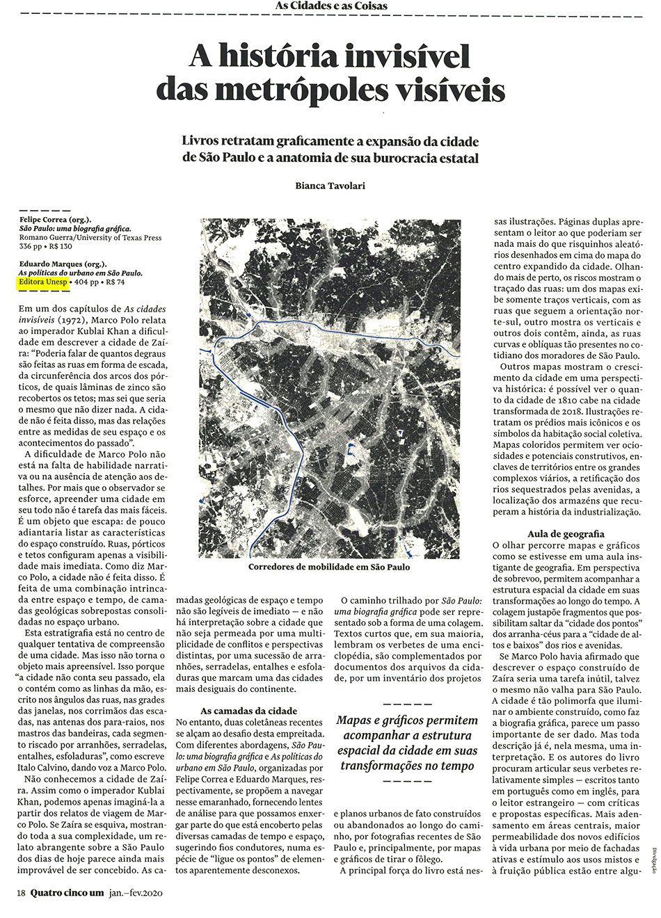 A edição de janeiro da revista Quatro Cinco Um reserva duas páginas para falar sobre livros que retratam graficamente a expansão da cidade de São Paulo e a anatomia da burocracia estatal, mostrando como mapas e gráficos colaboram nesse acompanhamento da estrutura espacial da cidade ao longo do tempo.