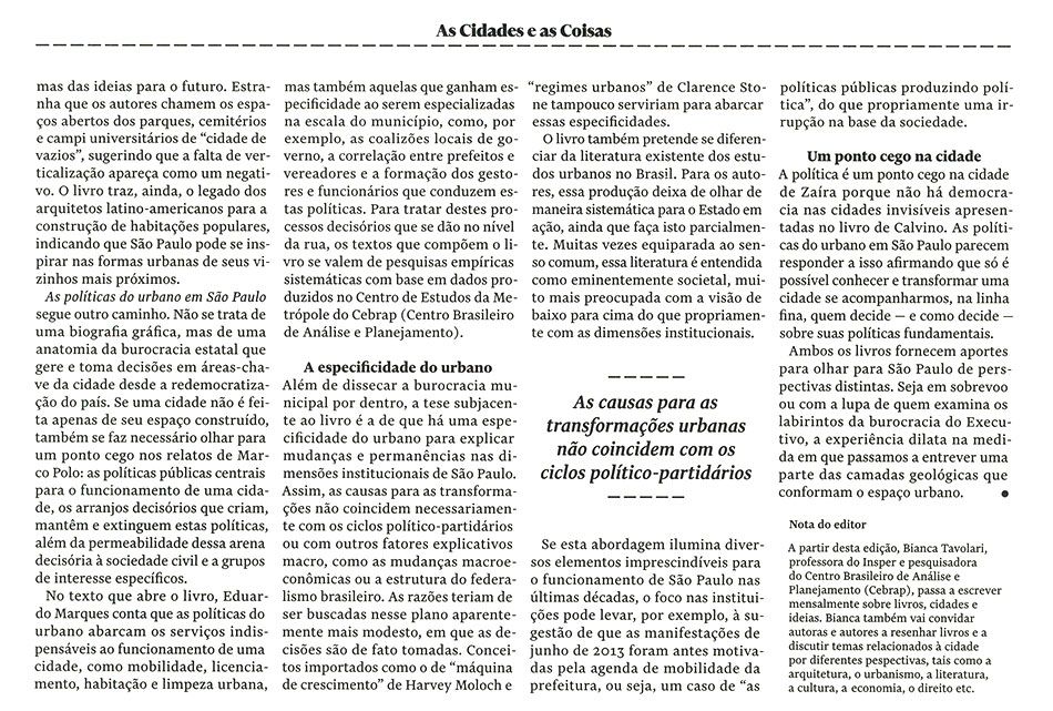 A publicação da Editora Unesp As políticas do urbano em São Paulo, de Eduardo Marques, é destacada no texto mostrando como o autor afirma que as políticas do urbano abarcam os serviços indispensáveis ao funcionamento de uma cidade, como mobilidade, licenciamento, habitação e limpeza urbana.