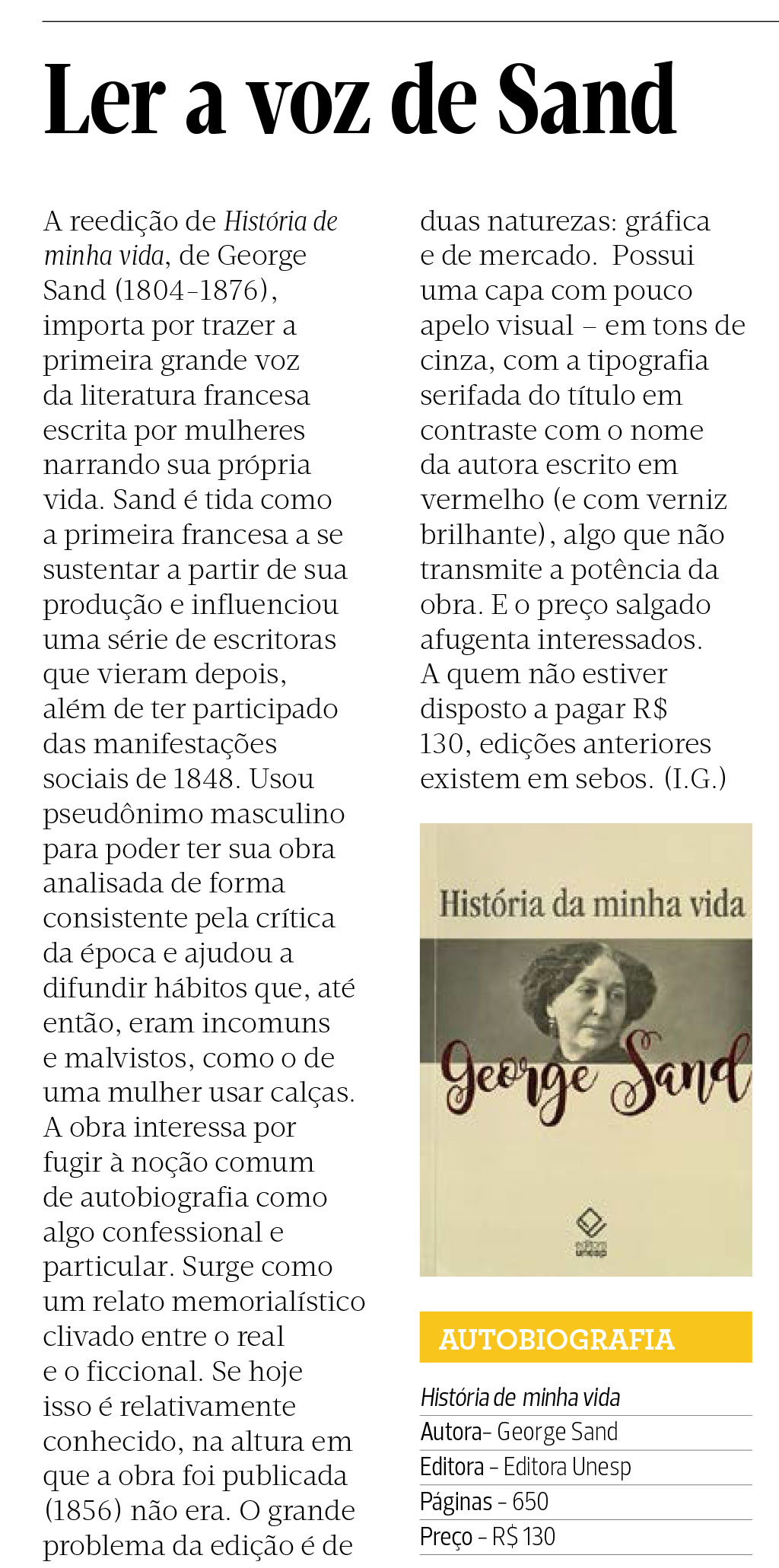 A edição de setembro do Suplemento Pernambuco recomendou os lançamentos História da minha vida, de George Sand e Nova história da arte, de Affonso Romano de Sant'Anna. Confira abaixo: