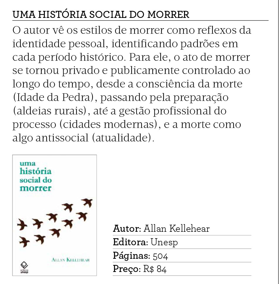 O Suplemento Pernambuco, em sua edição de agosto, indicou a leitura de Uma história social do morrer, de Allan Kellehear. O autor justifica seu interesse no morrer porque, ao estudá-lo, vemos o reflexo do tipo de pessoa que somos. Ou seja, a conduta no morrer revela as forças sutis, íntimas e desapercebidas em nossa vida cotidiana que moldam nossa identidade e individualidade.