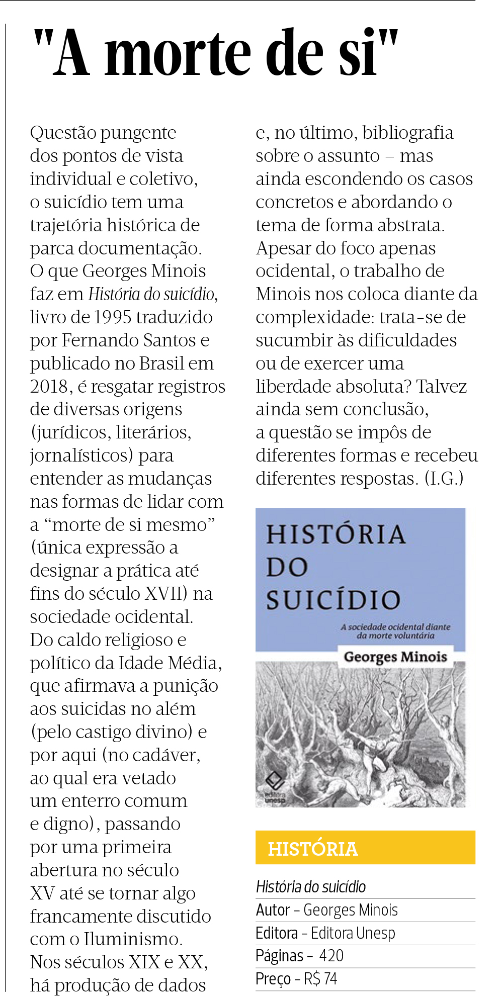 O Suplemento Pernambuco recomendou a leitura do lançamento História do suicídio: A sociedade ocidental diante da morte voluntária, de Georges Minois. O autor realiza um voo de amplo alcance, debruçando-se sobre farta documentação, para tentar ampliar nosso arsenal argumentativo sobre um dos últimos tabus do nosso tempo.