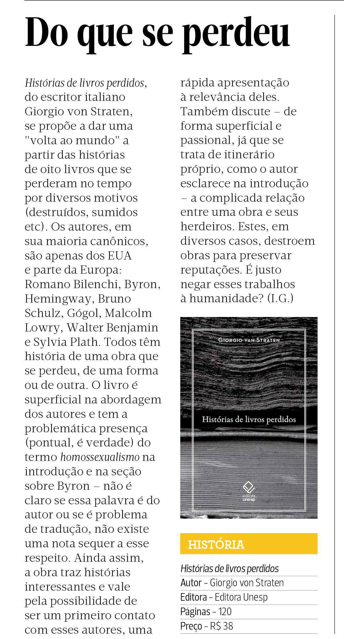 O Suplemento Pernambuco, em sua edição de outubro, recomendou o lançamento Histórias de livros perdidos, de Giorgio van Straten. A obra conta a jornada em busca de oito livros perdidos, livros quase míticos: todos aqueles que os procuram estão certos de que existem e de que vão encontrá-los, mas ninguém realmente tem provas concretas e conhece rotas seguras até eles. Muitas vezes, as pistas são fugazes e a esperança de encontrar essas páginas é mínima. Mesmo assim, a viagem vale a pena.