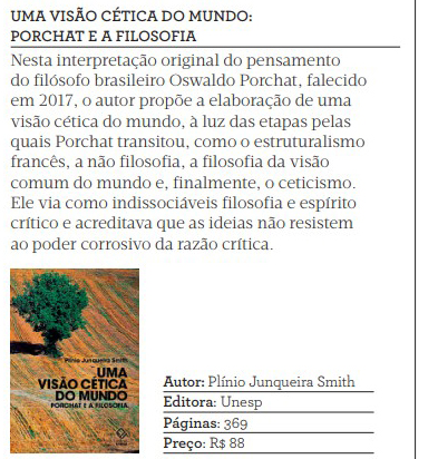 O Suplemento Pernambuco, em sua edição de junho, indicou a leitura do lançamento Uma visão cética do mundo: Porchat e a filosofia, de Plínio Junqueira Smith. Organizado em duas partes, este livro retoma todas essas mudanças pelas quais passou o pensamento de Porchat, ao traçar um quadro detalhado das suas diferentes fases e examinar suas opiniões sobre temas centrais da filosofia.