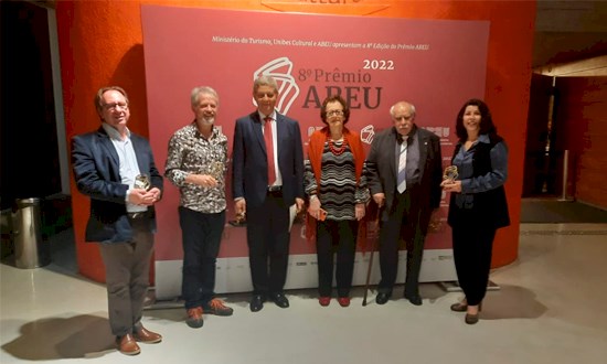 Diretor-presidente da FEU, Jézio Gutierre, autora de Glycério Geraldo Carnelosso, Ruth Sprung Tarasantchi, e o idealizador do projeto gráfico, Marcello de Oliveira, da KPMO Cultura e Arte, recebem troféu pelo 1º lugar na categoria Projeto gráfico