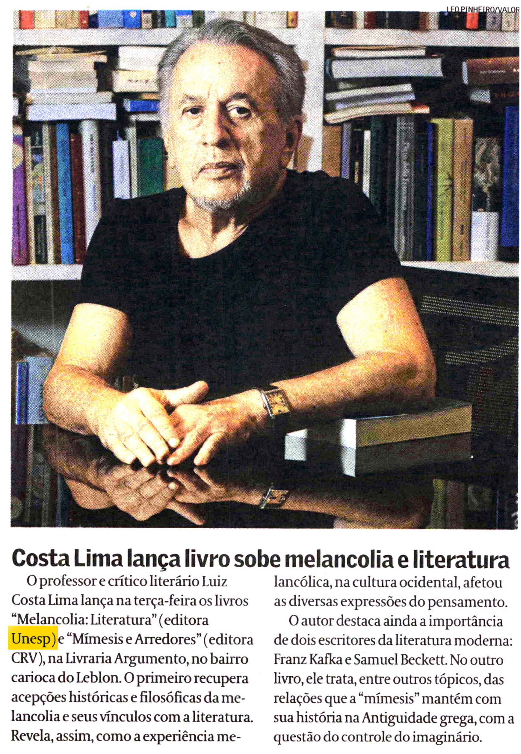 O jornal Valor Econômico indicou, em sua edição de 28 de julho de 2017, o lançamento Melancolia: Literatura, de Luiz Costa Lima. Nesta obra, Costa Lima recupera as acepções históricas e filosóficas da melancolia para estabelecer a articulação desse estado afetivo com a literatura. No percurso dessa investigação, o autor reconhece a condição de “criatura carente” no caráter humano – pathos da melancolia no discurso ficcional e plástico. Com essa tese, o ensaísta irradia sua análise para traços peculiares da produção de dois escritores decisivos da literatura moderna ocidental: o tcheco Franz Kafka e o irlandês Samuel Beckett. Ao fazer esse mapeamento extenso, estudado ora teórica ora textualmente, Costa Lima aponta como a experiência melancólica, na cultura ocidental, afetou de diferentes modos as diversas expressões do pensamento e das artes.