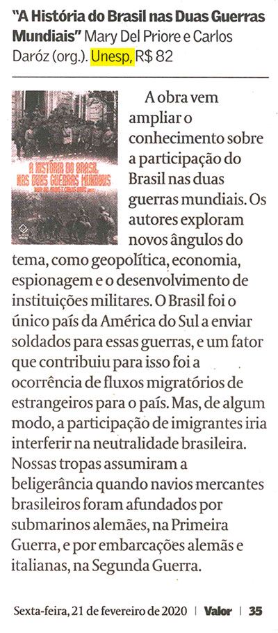 O jornal Valor Econômico recomendou o lançamento da Editora Unesp A história do Brasil nas duas guerras mundiais, organizado por Mary Del Priore e Carlos Daróz.