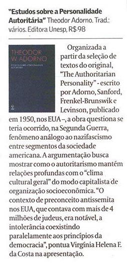 O jornal Valor Econômico de hoje, 7 de fevereiro, indicou o lançamento da Editora Unesp Estudos sobre a personalidade autoritária, de Theodor W. Adorno. Os textos que compõem a obra debatem como, em plena Segunda Guerra Mundial, o fascismo não era um episódio isolado, mas estava presente de forma latente em amostras da população norte-americana da época.