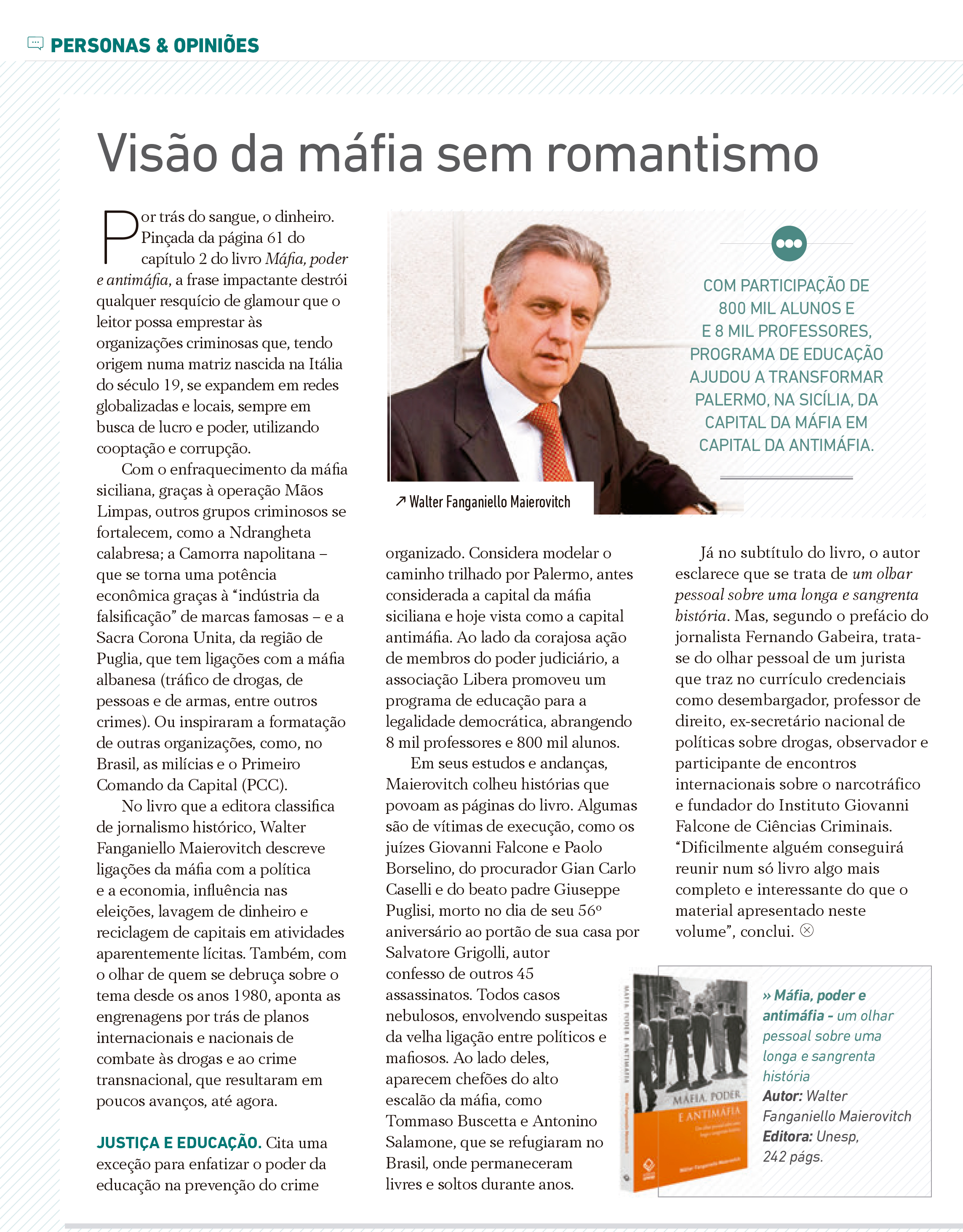 "Por trás do sangue, o dinheiro. Pinçada da página 61 do capítulo 2 do livro Máfia, poder e antimáfia, a frase impactante destrói qualquer resquício de glamour que o leitor possa emprestar às organizações criminosas que, tendo origem numa matriz nascida na Itália do século 19, se expandem em redes globalizadas e locais, sempre em busca de lucro e poder, utilizando cooptação e corrupção." Assim abre o artigo da editora executiva Jacyra Octaviano, na edição 13 da Revista CIEE, publicada pelo Centro de Integração Empresa-Escola, sobre o recente lançamento do jurista Wálter Fanganiello Maierovitch.
