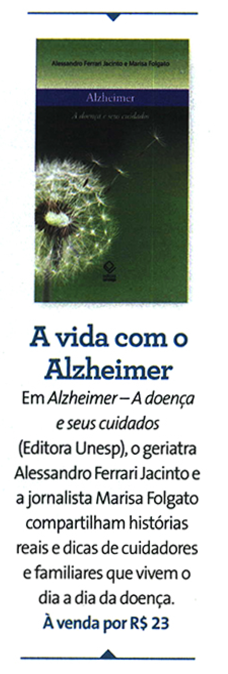 A revista Viva Saúde, em sua edição de junho, recomendou a leitura do lançamento Alzheimer: a doença e seus cuidados, de Alessandro Ferrari Jacinto e Marisa Folgato. Ao reunir histórias de pacientes, famílias e cuidadores, este trabalho do geriatra e professor Alessandro Ferrari Jacinto e da jornalista Marisa Folgato (filha de mãe doente de Alzheimer) extrapola as informações médicas e a resignação diante de uma doença que ainda não tem cura.