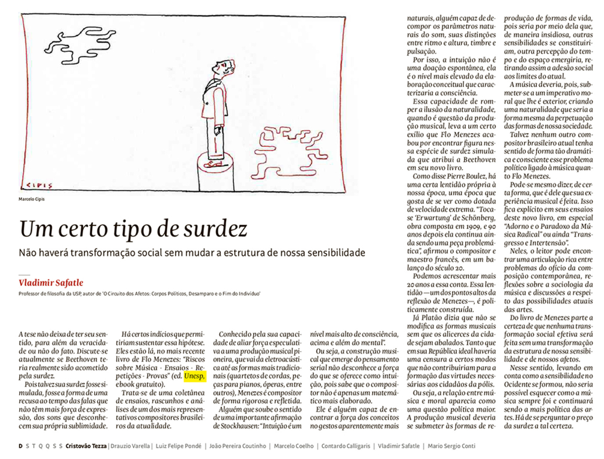 Vladimir Safatle, em coluna para o jornal Folha de S.Paulo, em 27 de julho, destacou o lançamento Riscos sobre música: Ensaios - Repetições - Provas, de Flo Menezes. No livro, disponível para download gratuito, Flo Menezes reúne seus principais textos e retoma a discussão estética sobre a música nova, além de publicar análises inéditas em forma de manuscritos de algumas das principais composições para a cena musical moderna. Os temas estão organizados em três partes: Ensaios, Repetições e Provas, nas quais o autor discorre sobre as vanguardas históricas, a música eletroacústica e sobre algumas de suas obras.