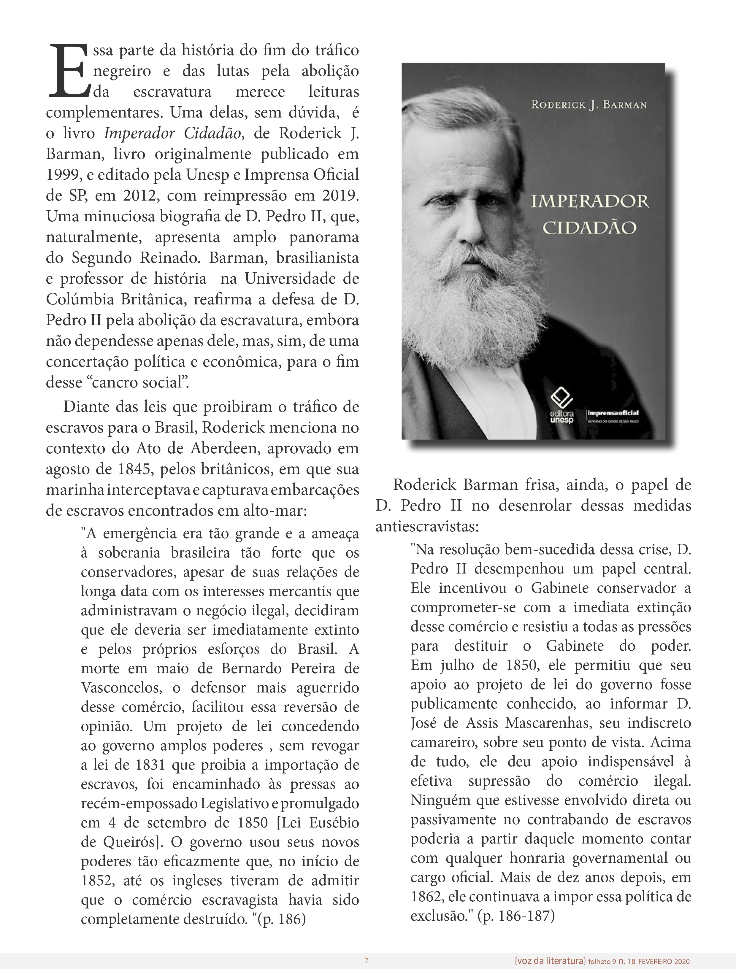 A edição de fevereiro da revista Voz da Literatura destaca o debate sobre o fim do tráfico negreiro e recomenda a leitura do lançamento da Editora Unesp, Imperador Cidadão, de Roderick J. Barman.