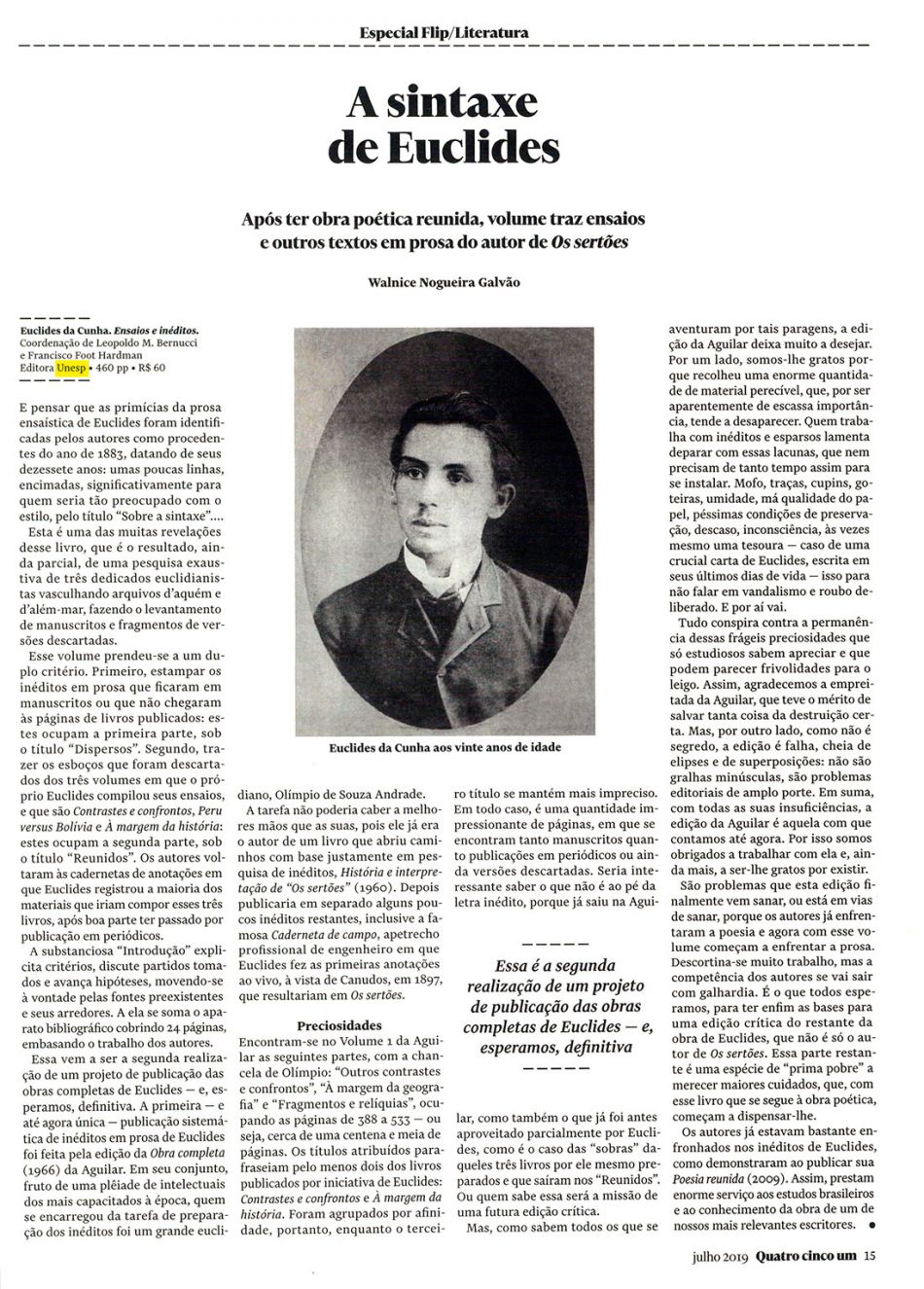 Walnice Nogueira resenhou para a revista Quatro Cinco Um a obra Ensaios e inéditos, de Euclides da Cunha. Trata-se de um total de 31 composições de Euclides que, em seu conjunto, reforçam a vertente ensaística de sua admirável escritura e que ficou consolidada definitivamente em Os sertões.